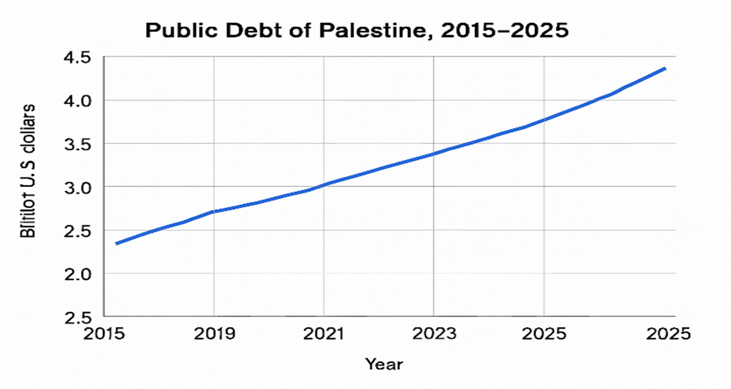 وفي موازاة هذا العامل البنيوي، أسهمت السياسات المالية للحكومات الفلسطينية المتعاقبة في تعميق الهشاشة الداخلية، فقد شهد الدين العام مسارًا تصاعديًا متواصلًا بين عامي 2015 و2025، مرتفعًا من نحو 2.3 مليار دولار إلى قرابة 4.7 مليار دولار، أي بزيادة تتجاوز 100% خلال عقد واحد. ويعكس هذا الاتجاه اعتمادًا متزايدًا على الاقتراض الداخلي، من البنوك والقطاع الخاص وصندوق التقاعد، لتغطية العجز المالي، في ظل تراجع الإيرادات العامة وانحسار الدعم الخارجي، إلى جانب استمرار الاقتطاعات الإسرائيلية من أموال المقاصة.
