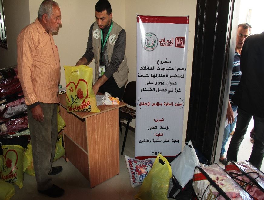 شرعت جمعية إعمار للتنمية والتأهيل، بتمويل من مؤسسة التعاون، بتنفيذ المرحلة الأولى من مشروع دعم احتياجات العائلات المتضررة جراء عدوان 2014 على قطاع غزة، للمساهمة في التمكين الاقتصادي والاجتماعي للعائلات المتضررة في محافظة خان يونس، خاصة فيما يتعلق باحتياجات فصل الشتاء.
