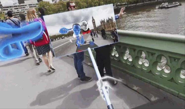 ولأنه لا بد من "صورة سيلفي" في كل رحلة سياحية، أخرج الشخص الآخر "عصا السيلفي" التي تملك مرآة افتراضية في طرفها البعيد، ووضع الاثنان رأسيهما "الافتراضيان" قرب بعضهما والتقطا "صورة سيلفي" أمام ساعة بيغ بن، ولم تكن الوجوه صورة فعلية للوجوه الأصلية، ولكن عبارة عن تمثيل ثلاثي الأبعاد أشبه بالرسم اليدوي، وذلك لأن التقنية ما تزال في بدايتها حسب فيسبوك، التي قالت إنها ستعمل على تطويرها كي تصبح أكثر واقعية في المستقبل.