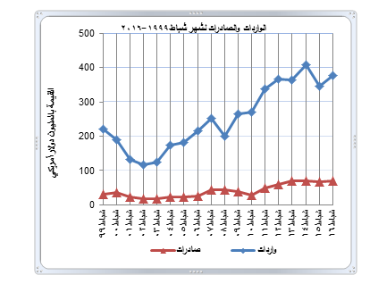 أما الميزان التجاري والذي يمثل الفرق بين الصادرات والواردات، فقد سجل انخفاضاً طفيفاً في قيمة العجز بنسبة 0.3% خلال شهر شباط 2016 مقارنة مع الشهر السابق، بينما ارتفع بنسبة 11.0% مقارنة مع الشهر المناظر من عام 2015، حيث وصل العجز إلى 308.3 مليون دولار أمريكي.