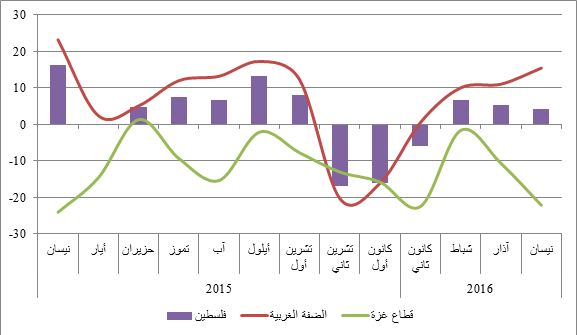أصدرت سلطة النقد نتائج "مؤشر سلطة النقد الفلسطينية لدورة الأعمال" لشهر نيسان 2016، والتي أشارت أنه بالرغم من تحسن قيمة المؤشر في الضفة الغربية إلا أن التراجع الملحوظ على قيمته في قطاع غزة أدى إلى تراجع بسيط في قيمة المؤشر في فلسطين خلال الشهر. فقد تراجعت قيمة المؤشر في فلسطين إلى نحو 4.1 نقطة خلال الشهر الحالي، مقارنة مع 5.4 نقطة في آذار الماضي، ونحو 16.3 نقطة في نيسان من العام السابق.