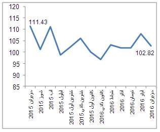 سجل الرقم القياسي لكميات الإنتاج الصناعي انخفاضاً مقداره 4.74% خلال شهر حزيران 2016 مقارنة بشهر أيار 2016، إذ انخفض الرقم القياسي لكميات الإنتاج الصناعي إلى 102.82 خلال شهر حزيران 2016 مقارنة بـ 107.94 خلال شهر أيار 2016 (شهر الأساس كانون أول 2015 = 100).