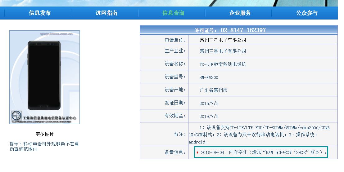 تعتزم شركة سامسونج إطلاق نسخة من هاتفها الذكي الجديد جالاكسي نوت7 Galaxy Note7 في الصين تمتاز بأنها تقدم ذاكرة وصول عشوائي “رام” بحجم 6 جيجابايتات، وفق ما أظهرت بيانات في وزارة صينية.