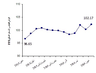 سجل الرقم القياسي العام لأسعار المنتج ارتفاعاً نسبته 1.86% خلال شهر تموز 2016 مقارنة مع شهر حزيران 2016، حيث بلغ الرقم القياسي العام 102.17 خلال شهر تموز 2016 مقارنة ﺒ 100.31 خلال شهر حزيران 2016 (شهر الأساس كانون أول 2015 = 100).