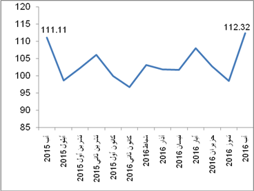 سجل الرقم القياسي لكميات الإنتاج الصناعي ارتفاعاً نسبته 14.01% خلال شهر آب 2016 مقارنة بشهر تموز 2016، إذ ارتفع الرقم القياسي لكميات الإنتاج الصناعي إلى 112.32 خلال شهر آب 2016 مقارنة بـ 98.52 خلال شهر تموز 2016 (شهر الأساس كانون أول 2015 = 100).
