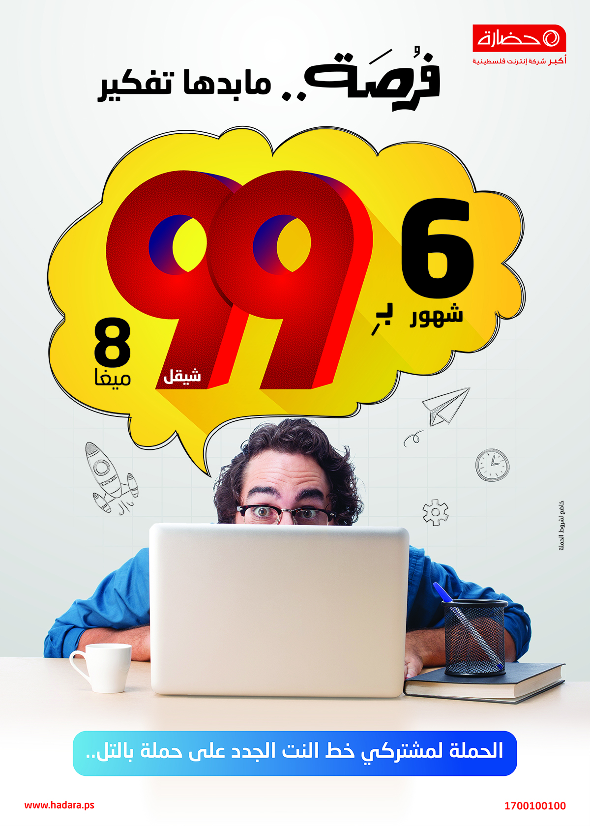 و قال مدير عام شركة حضارة السيد رامي قطينة أن حملة "فُرصة..ما بدها تفكير " تستهدف مشتركي حضارة الجدد الذين لديهم خط انترنت جديد من بالتل. وذلك حرصاً منها على تقديم العروض والخدمات المميزة لهم ،فالعرض الحالي خاص بسرعة 8 ميجا بسعر 99 شيقل لمدة 6 شهور مع خصم 50% على خدمات شركة حضارة المضافة . وبإمكان المشتركين الجدد الاشتراك بالحملة مرتين لمدة 3شهور . يأتي ذلك بهدف رفع مستوى الخدمات المقدمة من قبل "حضارة" لكافة المشتركين، بحيث تعمل باستمرار على تقديم العروض المميزة على سرعات خدمة الانترنت بأسعار منافسة تناسب المواطن الفلسطيني وبنفس الوقت لمنحه امكانية الاشتراك بالخدمة بأعلى سرعات و أقل تكلفة .