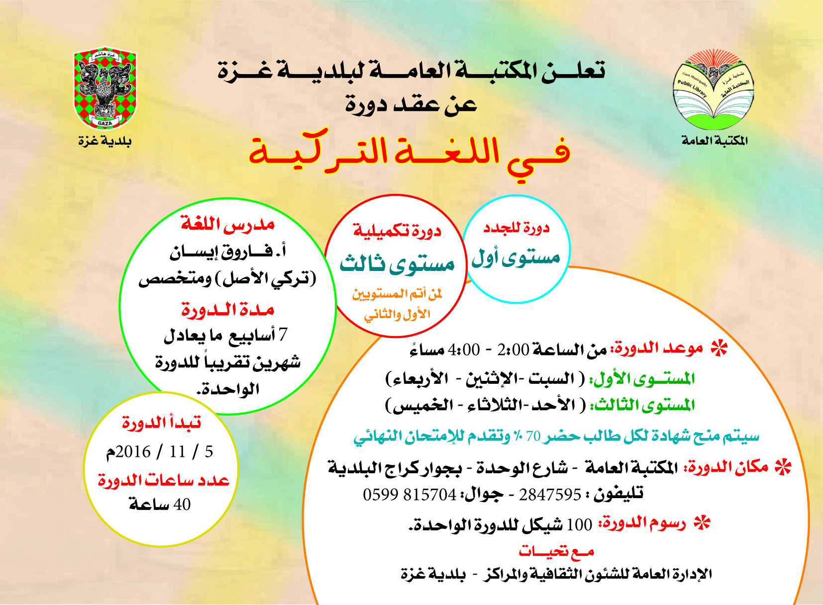 أعلنت المكتبة العامة التابعة لبلدية غزة عن بدء التسجيل في دورة اللغة التركية للراغبين في تعلم أساسيات اللغة التركية كلغة أجنبية .