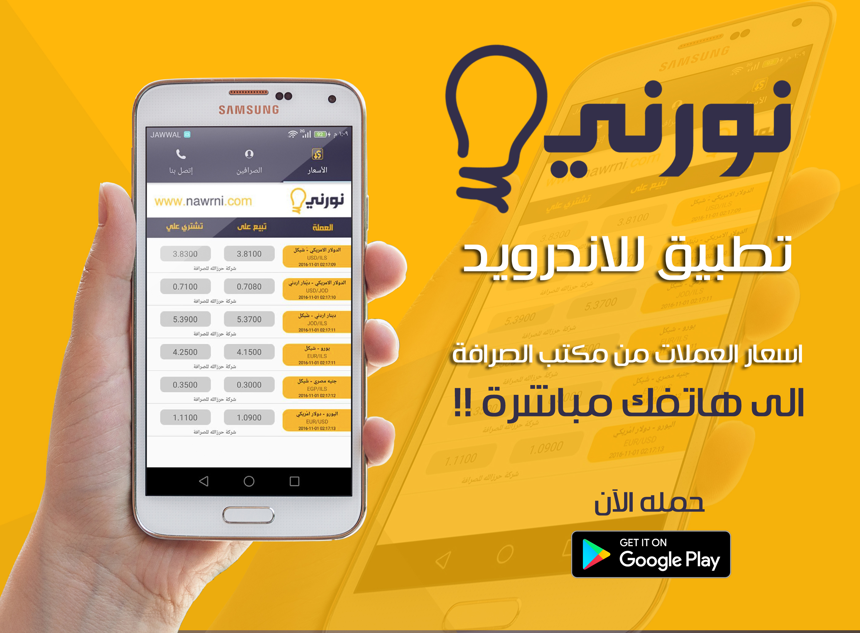 أعلنت الشركة الفلسطينية لخدمات الاستثمار المالي عن إطلاق تطبيق نورني أسعار العملات محلياً، وهو تطبيق مالي متخصص في عرض أسعار العملات في شركات الصرافة المحلية، وذلك للأجهزة المحمولة التي تعمل بنظام تشغيل أندرويد.