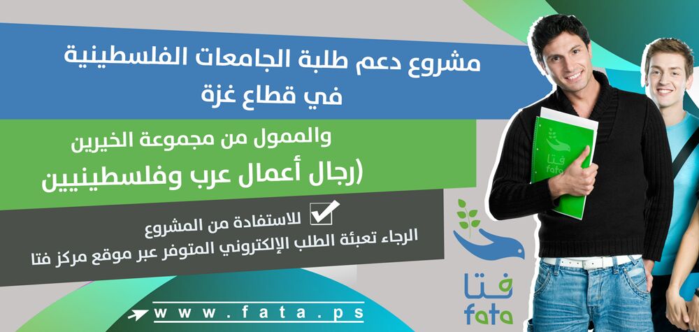 يعلن المركز الفلسطيني للتواصل الإنساني “فتا” عن البدء للتسجيل للاستفادة من (مشروع مساعدة طلبة الجامعات الفلسطينية لعدد 1000 طالب) في قطاع غزة، للفصل الدراسي الثاني من العام الجامعي 2016م/2017م، الممول من “رجال أعمال فلسطينيين وعرب خلال حفل فتا الخيري بــــ أبو ظبي“.