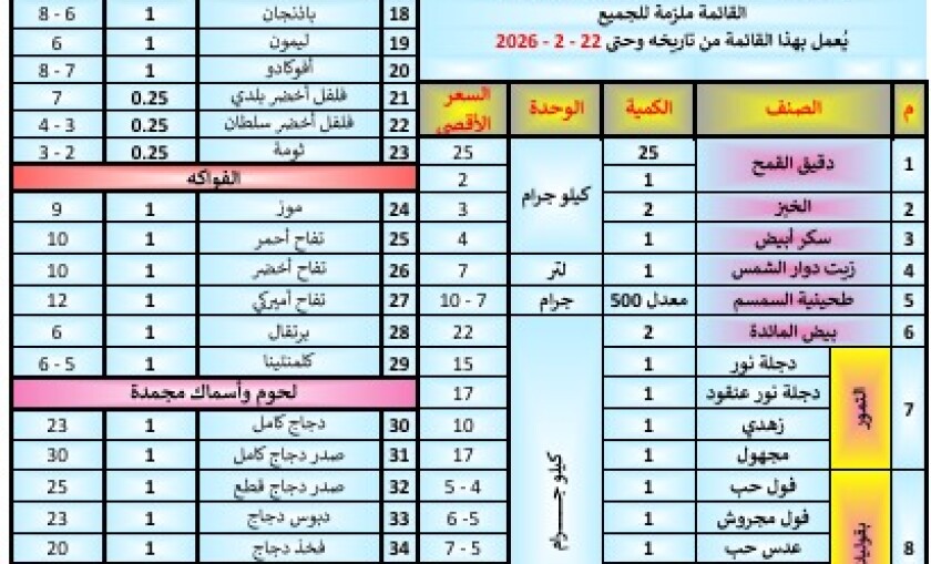 وبينت الوزارة أن كل من يخالف أسعار القائمة سيعرض نفسه للمساءلة القانونية.