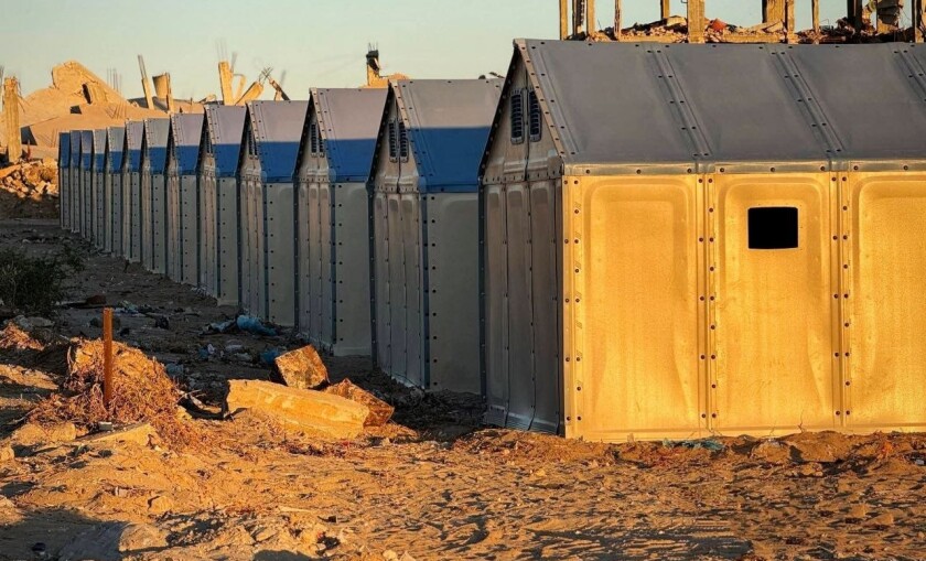 بدأت المرحلة الثانية من إنشاء مخيمات من مساكن الفيبر جلاس في حي الكتيبة بخانيونس جنوب قطاع غزة لإعادة النازحين من مناطق المواصي للسكن في أحيائهم المُدمرة.